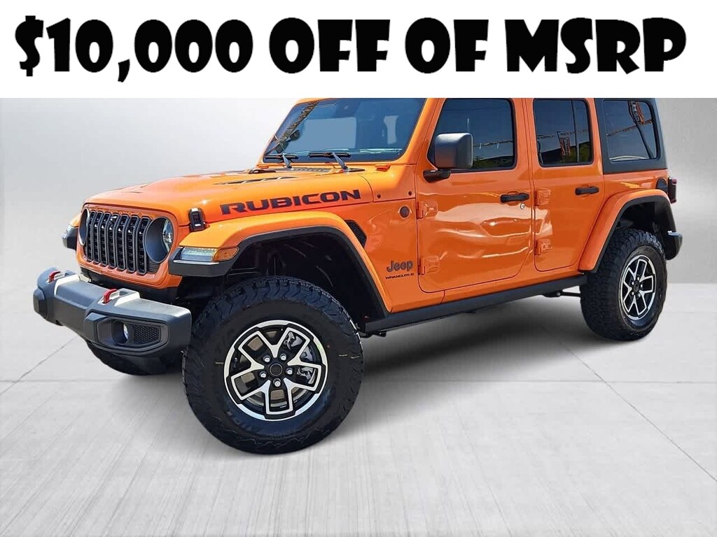 This Jeep comes with:Convenience Group (Heated Front Seats, Heated Steering Wheel, and Universal Garage Door Opener), Quick Order Package 24R Rubicon, Safety Group (Auto High Beam Headlamp Control, Blind Spot & Cross Path Detection, and ParkSense Rear Park Assist System), Technology Group (12.3 Touchscreen Display, 4G LTE Wi-Fi Hot Spot, Apple CarPlay, Auto-Dimming Rear-View Mirror, Connected Travel & Traffic Services, Connectivity - US/Canada, Google Android Auto, GPS Navigation, HD Radio, Integrated Off-Road Camera, Integrated Voice Command w/Bluetooth, Radio: Uconnect 5 Nav w/12.3 Display, SiriusXM Radio Service, and SiriusXM w/360L), 4-Wheel Disc Brakes, 4.10 Rear Axle Ratio, 8 Speakers, 97 MPH Vehicle Max Speed Calibration, ABS brakes, Air Conditioning, Alloy wheels, Alpine Premium Audio System, AM/FM radio: SiriusXM, Apple CarPlay/Android Auto, Automatic temperature control, Aux Battery, Auxiliary Switches, Black 3-Piece Hard Top, Body Color Rubicon Highline Flare, Brake assist, Class II Receiver Hitch, Cloth Low-Back Bucket Seats, Compass, Delay-off headlights, Driver door bin, Driver vanity mirror, Dual front impact airbags, Dual front side impact airbags, Electronic Stability Control, Emergency communication system: Jeep Connect, Freedom Panel Storage Bag, Front anti-roll bar, Front Bucket Seats, Front Center Armrest w/Storage, Front dual zone A/C, Front fog lights, Front License Plate Bracket (DISC), Front reading lights, Fully automatic headlights, Heated door mirrors, Illuminated entry, Integrated roll-over protection, Jeep Trail Rated Kit, Low tire pressure warning, MOPAR All-Weather Floor Mats, Non-Lock Fuel Cap w/o Discriminator, Occupant sensing airbag, Outside temperature display, Overhead airbag, Panic alarm, ParkView Rear Back-Up Camera, Passenger door bin, Passenger vanity mirror, Performance Suspension, Power door mirrors, Power steering, Power windows, Radio data system, Radio: Uconnect 5 w/12.3 Display, Rear anti-roll bar, Rear reading lights, Rear Window Defroster, Rear Window Wiper/Washer, Remote keyless entry, Security system, Speed control, Split folding rear seat, Steering wheel mounted audio controls, Stop-Start Dual Battery System, Tachometer, Telescoping steering wheel, Tilt steering wheel, Traction control, Trip computer, Variably intermittent wipers, Voltmeter, and Wheels: 17 x 7.5 Machined/Painted Black. Prices do not include Protection Package + includes Vehicle Tint at $599, Door Edge Guards at $399, Wheel Locks at $199, PermaPlate at $700, LoJack at $1,199 and Etch at $899. Price does not include $699 Dealer Documentation Fee, taxes, and license fee. Price includes: $2500 - 2025 National Retail Bonus Cash . Exp. 11/03/2025