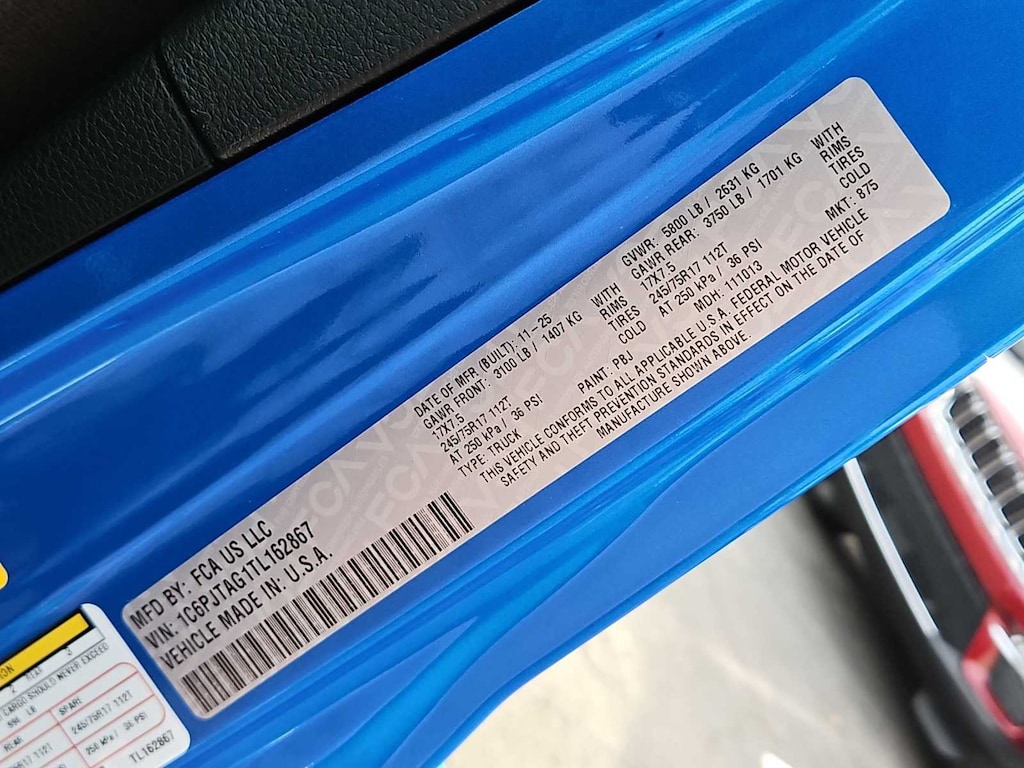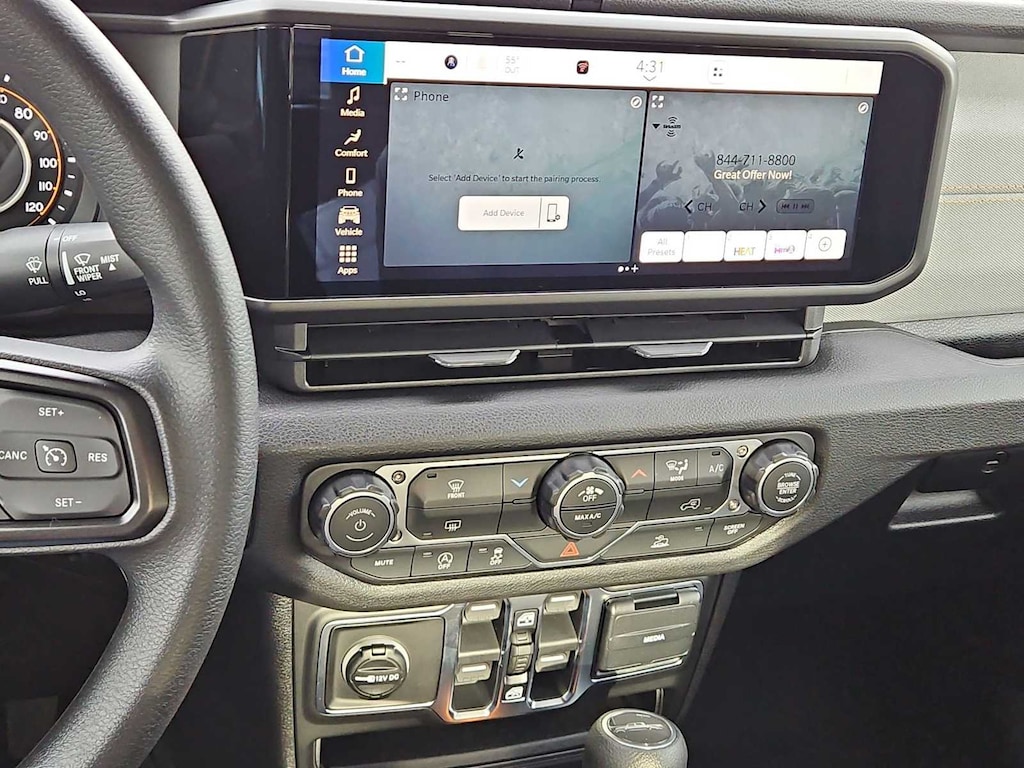 This Jeep comes with:Quick Order Package 24B Sport, 110 Mph Vehicle Max Speed Calibration, 12.3 Touchscreen Display, 3.73 Rear Axle Ratio, 4-Wheel Disc Brakes, 4G LTE Wi-Fi Hot Spot, 8 Speakers, ABS brakes, Air Conditioning, Alexa Built-in, AM/FM radio: SiriusXM with 360L, Apple CarPlay, Apple CarPlay/Android Auto, Black 3-Piece Hard Top, Brake assist, Compass, Connectivity - US/Canada, Delay-off headlights, Driver door bin, Driver vanity mirror, Dual front impact airbags, Dual front side impact airbags, Electronic Stability Control, For Details, Visit DriveUconnect.com, Freedom Panel Storage Bag, Front anti-roll bar, Front Bucket Seats, Front Center Armrest w/Storage, Front fog lights, Front License Plate Bracket, Front reading lights, Google Android Auto, Illuminated entry, Integrated Center Stack Radio, Integrated roll-over protection, Low tire pressure warning, MOPAR All-Weather Slush Mats, MOPAR Spray in Bedliner, Normal Duty Suspension, Occupant sensing airbag, Outside temperature display, Overhead airbag, Panic alarm, ParkView Rear Back-Up Camera, Passenger door bin, Passenger vanity mirror, Power steering, Power windows, Radio data system, Radio: Uconnect 5 with 12.3 Display, Rear anti-roll bar, Rear reading lights, Rear Sliding Window, Rear Window Defroster, Remote keyless entry, SiriusXM Radio Service, SiriusXM with 360L, Speed control, Split folding rear seat, Steering wheel mounted audio controls, Tachometer, Telescoping steering wheel, Tilt steering wheel, Traction control, Trip computer, USB Host Flip, Variably intermittent wipers, Voltmeter, and Wheels: 17 x 7.5 Black Steel StyleD. Prices do not include Protection Package + includes Vehicle Tint at $599, Door Edge Guards at $399, Wheel Locks at $199, PermaPlate at $700, LoJack at $1,199 and Etch at $899. Price does not include $699 Dealer Documentation Fee, taxes, and license fee. Price includes: $1000 - 2026 National Retail Bonus Cash . Exp. 04/30/2026 $1000 - 2026 West BC Retail Bonus Cash . Exp. 04/30/2026