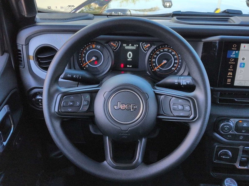 This Jeep comes with:Quick Order Package 24B Sport, 110 Mph Vehicle Max Speed Calibration, 12.3 Touchscreen Display, 3.73 Rear Axle Ratio, 4-Wheel Disc Brakes, 4G LTE Wi-Fi Hot Spot, 8 Speakers, ABS brakes, Air Conditioning, Alexa Built-in, AM/FM radio: SiriusXM with 360L, Apple CarPlay, Apple CarPlay/Android Auto, Black 3-Piece Hard Top, Brake assist, Compass, Connectivity - US/Canada, Delay-off headlights, Driver door bin, Driver vanity mirror, Dual front impact airbags, Dual front side impact airbags, Electronic Stability Control, For Details, Visit DriveUconnect.com, Freedom Panel Storage Bag, Front anti-roll bar, Front Bucket Seats, Front Center Armrest w/Storage, Front fog lights, Front License Plate Bracket, Front reading lights, Google Android Auto, Illuminated entry, Integrated Center Stack Radio, Integrated roll-over protection, Low tire pressure warning, MOPAR All-Weather Slush Mats, MOPAR Spray in Bedliner, Normal Duty Suspension, Occupant sensing airbag, Outside temperature display, Overhead airbag, Panic alarm, ParkView Rear Back-Up Camera, Passenger door bin, Passenger vanity mirror, Power steering, Power windows, Radio data system, Radio: Uconnect 5 with 12.3 Display, Rear anti-roll bar, Rear reading lights, Rear Sliding Window, Rear Window Defroster, Remote keyless entry, SiriusXM Radio Service, SiriusXM with 360L, Speed control, Split folding rear seat, Steering wheel mounted audio controls, Tachometer, Telescoping steering wheel, Tilt steering wheel, Traction control, Trip computer, USB Host Flip, Variably intermittent wipers, Voltmeter, and Wheels: 17 x 7.5 Black Steel StyleD. Prices do not include Protection Package + includes Vehicle Tint at $599, Door Edge Guards at $399, Wheel Locks at $199, PermaPlate at $700, LoJack at $1,199 and Etch at $899. Price does not include $699 Dealer Documentation Fee, taxes, and license fee. Price includes: $1000 - 2026 West BC Retail Bonus Cash . Exp. 03/02/2026