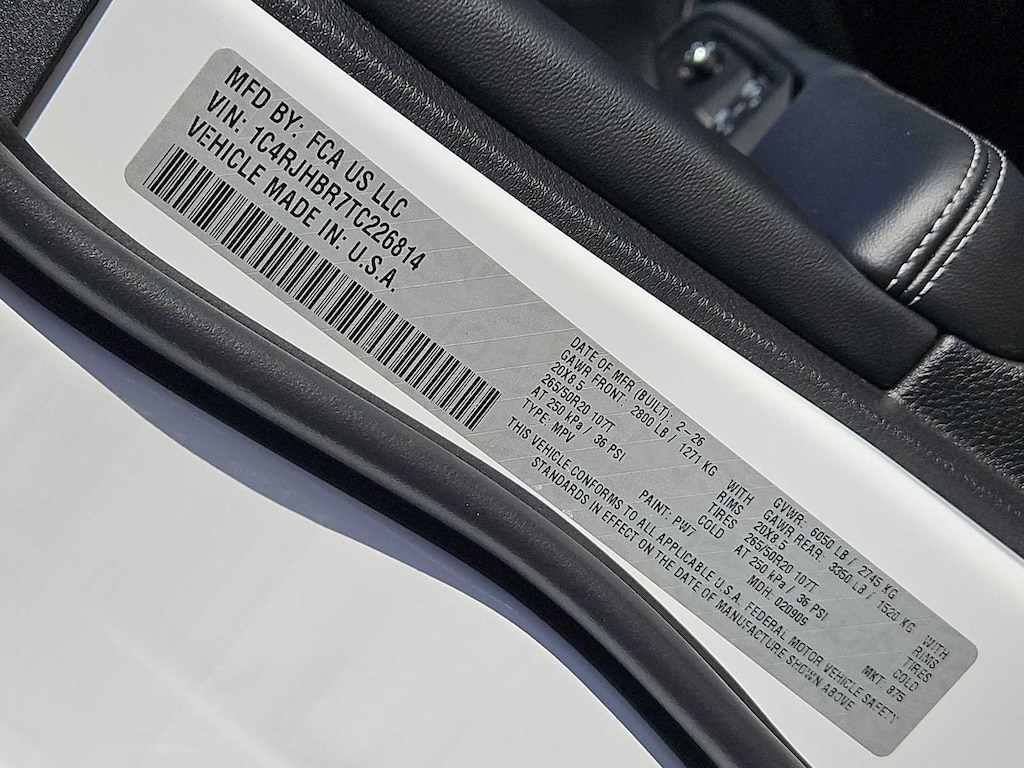 This Jeep comes with:Quick Order Package 2BE Limited, 4WD, 10 Speakers, 3.70 Rear Axle Ratio, 4-Wheel Disc Brakes, 4G LTE Wi-Fi Hot Spot, ABS brakes, Active Noise Control System, Air Conditioning, Alloy wheels, AM/FM radio: SiriusXM with 360L, Anti-whiplash front head restraints, Apple CarPlay, AppLink/Apple CarPlay and Android Auto, Audio memory, Auto High-beam Headlights, Automatic temperature control, Auxiliary Battery, Brake assist, Bumpers: body-color, Capri Leatherette Seats, Compass, Connectivity - US/Canada, Delay-off headlights, Disassociated Touchscreen Display, Driver door bin, Driver vanity mirror, Dual front impact airbags, Dual front side impact airbags, Dual-Pane Panoramic Sunroof, Electronic Stability Control, Emergency communication system, For Details, Visit DriveUconnect.com, Four wheel independent suspension, Front anti-roll bar, Front Bucket Seats, Front Center Armrest w/Storage, Front dual zone A/C, Front fog lights, Front License Plate Bracket, Front reading lights, Fully automatic headlights, Garage door transmitter, Global Telematics Box Module (TBM), Gloss Black Exterior Mirrors, Google Android Auto, GPS Antenna Input, Heated door mirrors, Heated Exterior Mirrors, Heated front seats, Heated rear seats, Heated steering wheel, Illuminated entry, Integrated Center Stack Radio, Integrated Voice Command with Bluetooth, Knee airbag, Low tire pressure warning, Manual Folding Exterior Mirrors, Memory seat, Navigation System, Normal Duty Suspension, Occupant sensing airbag, Outside temperature display, Overhead airbag, Overhead console, Panic alarm, ParkView Rear Back-Up Camera, Passenger door bin, Passenger vanity mirror, Power door mirrors, Power driver seat, Power Liftgate, Power passenger seat, Power steering, Power windows, Radio data system, Radio: Uconnect 5 Nav with 12.3 Display, Rear anti-roll bar, Rear reading lights, Rear window defroster, Rear window wiper, Remote keyless entry, Security system, Speed control, Speed-Sensitive Wipers, Split folding rear seat, Spoiler, Steering wheel mounted audio controls, Tachometer, Telescoping steering wheel, Tilt steering wheel, Traction control, Trip computer, Turn signal indicator mirrors, USB Host Flip, Variably intermittent wipers, Voltmeter, Wheels: 18 x 8.0 Polished/Painted Aluminum, and Wheels: 20 x 8.5 Machined/Painted AluminuM. Prices do not include Protection Package + includes Vehicle Tint at $599, Door Edge Guards at $399, Wheel Locks at $199, PermaPlate at $700, LoJack at $1,199 and Etch at $899. Price does not include $699 Dealer Documentation Fee, taxes, and license fee. Price includes: $1500 - 2026 National Retail Bonus Cash . Exp. 04/30/2026