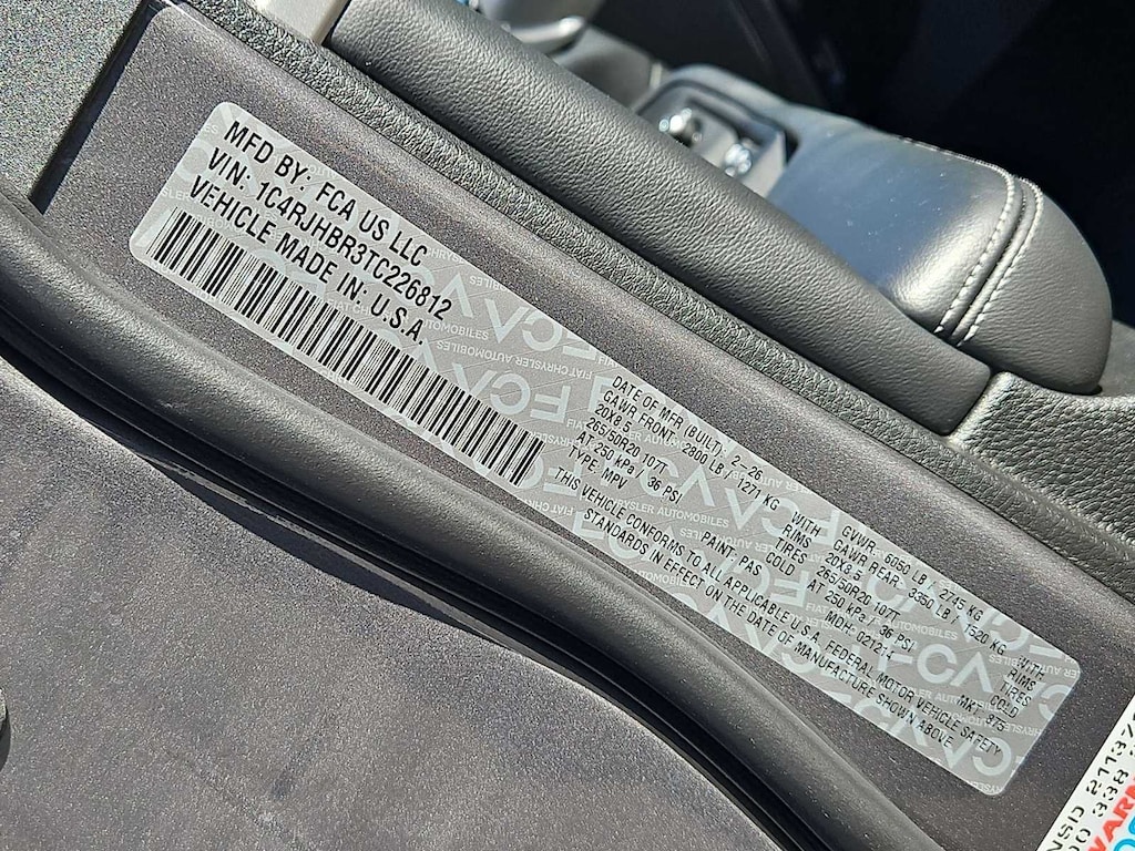 This Jeep comes with:Quick Order Package 2BE Limited, 4WD, 10 Speakers, 3.70 Rear Axle Ratio, 4-Wheel Disc Brakes, 4G LTE Wi-Fi Hot Spot, ABS brakes, Active Noise Control System, Air Conditioning, Alloy wheels, AM/FM radio: SiriusXM with 360L, Anti-whiplash front head restraints, Apple CarPlay, AppLink/Apple CarPlay and Android Auto, Audio memory, Auto High-beam Headlights, Automatic temperature control, Auxiliary Battery, Brake assist, Bumpers: body-color, Capri Leatherette Seats, Compass, Connectivity - US/Canada, Delay-off headlights, Disassociated Touchscreen Display, Driver door bin, Driver vanity mirror, Dual front impact airbags, Dual front side impact airbags, Dual-Pane Panoramic Sunroof, Electronic Stability Control, Emergency communication system, For Details, Visit DriveUconnect.com, Four wheel independent suspension, Front anti-roll bar, Front Bucket Seats, Front Center Armrest w/Storage, Front dual zone A/C, Front fog lights, Front License Plate Bracket, Front reading lights, Fully automatic headlights, Garage door transmitter, Global Telematics Box Module (TBM), Gloss Black Exterior Mirrors, Google Android Auto, GPS Antenna Input, Heated door mirrors, Heated Exterior Mirrors, Heated front seats, Heated rear seats, Heated steering wheel, Illuminated entry, Integrated Center Stack Radio, Integrated Voice Command with Bluetooth, Knee airbag, Low tire pressure warning, Manual Folding Exterior Mirrors, Memory seat, Navigation System, Normal Duty Suspension, Occupant sensing airbag, Outside temperature display, Overhead airbag, Overhead console, Panic alarm, ParkView Rear Back-Up Camera, Passenger door bin, Passenger vanity mirror, Power door mirrors, Power driver seat, Power Liftgate, Power passenger seat, Power steering, Power windows, Radio data system, Radio: Uconnect 5 Nav with 12.3 Display, Rear anti-roll bar, Rear reading lights, Rear window defroster, Rear window wiper, Remote keyless entry, Security system, Speed control, Speed-Sensitive Wipers, Split folding rear seat, Spoiler, Steering wheel mounted audio controls, Tachometer, Telescoping steering wheel, Tilt steering wheel, Traction control, Trip computer, Turn signal indicator mirrors, USB Host Flip, Variably intermittent wipers, Voltmeter, Wheels: 18 x 8.0 Polished/Painted Aluminum, and Wheels: 20 x 8.5 Machined/Painted AluminuM. Prices do not include Protection Package + includes Vehicle Tint at $599, Door Edge Guards at $399, Wheel Locks at $199, PermaPlate at $700, LoJack at $1,199 and Etch at $899. Price does not include $699 Dealer Documentation Fee, taxes, and license fee. Price includes: $1500 - 2026 National Retail Bonus Cash . Exp. 04/30/2026
