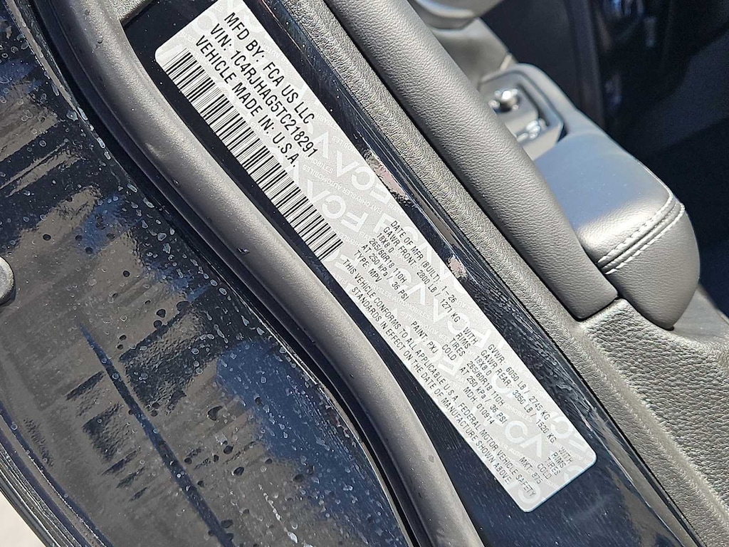 This Jeep comes with:Quick Order Package 22J Laredo X (115V Auxiliary Power Outlet, Heated Front Seats, Heated Steering Wheel, Power Liftgate, Power Sunroof, Rain Sensitive Windshield Wipers, Remote Start System, Secondary Active Grille Shutters, Selectable Tire Fill Alert, and Wireless Charging Pad), 4WD, 3.45 Rear Axle Ratio, 4-Wheel Disc Brakes, 4G LTE Wi-Fi Hot Spot, 6 Speakers, ABS brakes, Air Conditioning, Alloy wheels, AM/FM radio: SiriusXM, Anti-whiplash front head restraints, Apple CarPlay, AppLink/Apple CarPlay and Android Auto, Automatic temperature control, Auxiliary Battery, Brake assist, Bumpers: body-color, Cloth Seats, Compass, Connectivity - US/Canada, Delay-off headlights, Disassociated Touchscreen Display, Driver door bin, Driver vanity mirror, Dual front impact airbags, Dual front side impact airbags, Electronic Stability Control, Emergency communication system, For Details, Visit DriveUconnect.com, Four wheel independent suspension, Front anti-roll bar, Front Bucket Seats, Front Center Armrest w/Storage, Front dual zone A/C, Front License Plate Bracket, Front reading lights, Fully automatic headlights, Global Telematics Box Module (TBM), Gloss Black Exterior Mirrors, Google Android Auto, GPS Antenna Input, Heated door mirrors, Heated Exterior Mirrors, Illuminated entry, Integrated Center Stack Radio, Integrated Voice Command with Bluetooth, Knee airbag, Low tire pressure warning, Manual Folding Exterior Mirrors, Normal Duty Suspension, Occupant sensing airbag, Outside temperature display, Overhead airbag, Overhead console, Panic alarm, ParkView Rear Back-Up Camera, Passenger door bin, Passenger vanity mirror, Power door mirrors, Power driver seat, Power steering, Power windows, Radio data system, Radio: Uconnect 5 with 8.4 Display, Rear anti-roll bar, Rear reading lights, Rear window defroster, Rear window wiper, Remote keyless entry, Security system, Speed control, Speed-Sensitive Wipers, Split folding rear seat, Spoiler, Steering wheel mounted audio controls, Tachometer, Telescoping steering wheel, Tilt steering wheel, Traction control, Trip computer, USB Host Flip, Variably intermittent wipers, Voltmeter, and Wheels: 18 x 8.0 Fully Painted AluminuM. Prices do not include Protection Package + includes Vehicle Tint at $599, Door Edge Guards at $399, Wheel Locks at $199, PermaPlate at $700, LoJack at $1,199 and Etch at $899. Price does not include $699 Dealer Documentation Fee, taxes, and license fee. Price includes: $1500 - 2026 National Retail Bonus Cash . Exp. 04/30/2026