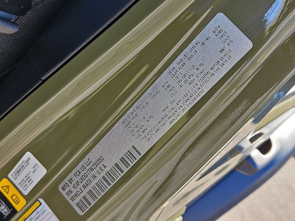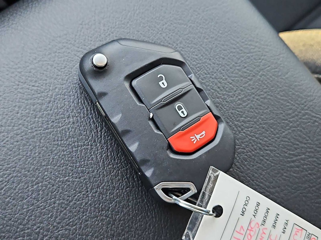 This Jeep comes with:Quick Order Package 24B Sport, 12.3 Touchscreen Display, 3.45 Overall Top Gear Ratio, 4-Wheel Disc Brakes, 4G LTE Wi-Fi Hot Spot, 8 Speakers, ABS brakes, Air Conditioning, AM/FM radio: SiriusXM with 360L, Apple CarPlay, Apple CarPlay/Android Auto, Aux Battery, Black 3-Piece Hard Top, Brake assist, Compass, Connectivity - US/Canada, Delay-off headlights, Driver door bin, Driver vanity mirror, Dual front impact airbags, Dual front side impact airbags, Electronic Stability Control, For More Info, Call 800-643-2112, Freedom Panel Storage Bag, Front anti-roll bar, Front Bucket Seats, Front Center Armrest w/Storage, Front fog lights, Front reading lights, Google Android Auto, Illuminated entry, Integrated Center Stack Radio, Integrated roll-over protection, Jeep Trail Rated Kit, Low tire pressure warning, Manufacture Statement of Origin, MOPAR All-Weather Floor Mats, No Soft Top, Non-Lock Fuel Cap Without Discriminator, Normal Duty Suspension, Occupant sensing airbag, Outside temperature display, Overhead airbag, Panic alarm, ParkView Rear Back-Up Camera, Passenger door bin, Passenger vanity mirror, Power steering, Power windows, Radio data system, Radio: Uconnect 5 with 12.3 Display, Rear anti-roll bar, Rear reading lights, Rear Window Defroster, Rear Window Wiper/Washer, Remote keyless entry, SiriusXM Radio Service, SiriusXM with 360L, Speed control, Split folding rear seat, Steering wheel mounted audio controls, Stop-Start Dual Battery System, Tachometer, Telescoping steering wheel, Tilt steering wheel, Traction control, Trip computer, Variably intermittent wipers, and Wheels: 17 x 7.5 Black Steel Styled. Prices do not include Protection Package + includes Vehicle Tint at $599, Door Edge Guards at $399, Wheel Locks at $199, PermaPlate at $700, LoJack at $1,199 and Etch at $899. Price does not include $699 Dealer Documentation Fee, taxes, and license fee. Price includes: $1000 - 2026 National Retail Bonus Cash . Exp. 04/30/2026